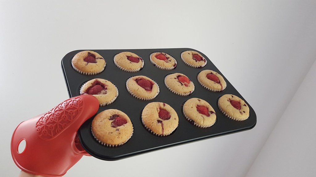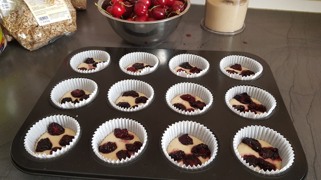 Apoi, punem cate 4 jumatati de mure in fiecare briosa, iar deasupra punem inca aprox. 1 lingura de compozitie (impartim cu grija astfel incat sa ajunga pentru toate briosele). Atentie, nu este nevoie ca hartiutele sa fie umplute pana sus si nici sa arate perfect inainte de a fi bagate in cuptor deoarece vor creste si se va “aseza” singur aluatul. Optional, pentru decor, se pot pune deasupra jumatati de capsuni sau alte fructe in functie de preferinte.