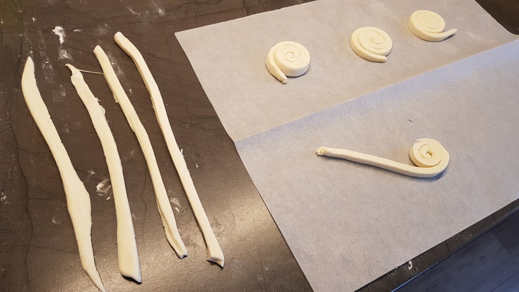 Urmeaza sa taiem aluatul in fasii lungi si inguste cat un deget. Luam fiecare fasie, o punem pe latura ingusta (adica cea de grosime aprox. 5 mm) si o rulam NU PREA STRANS pana obtinem un melc, ca in poza de mai jos: