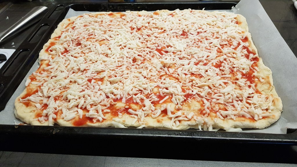 Urmeaza sa intindem sosul de rosii peste aluat, sa presaram mozarella peste, iar la final sa punem topping-urile preferate deasupra.