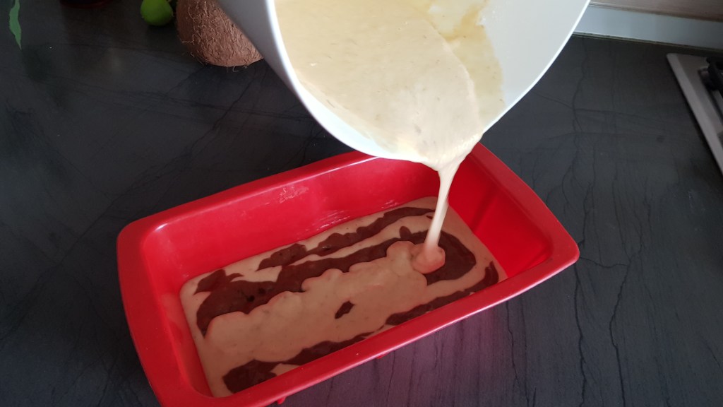 Urmeaza sa turnam compozitia in tava de chec in straturi pentru a obtine efectul marmorat: turnam un strat subtire de compozitie alba pe fundul tavii, apoi deasupra un strat de compozitie neaga, apoi un strat alb, apoi unul negru… pana terminam toata compozitia. Odata ce incepeti sa turnati compozitia va veti da seama ca este mai usor decat pare.