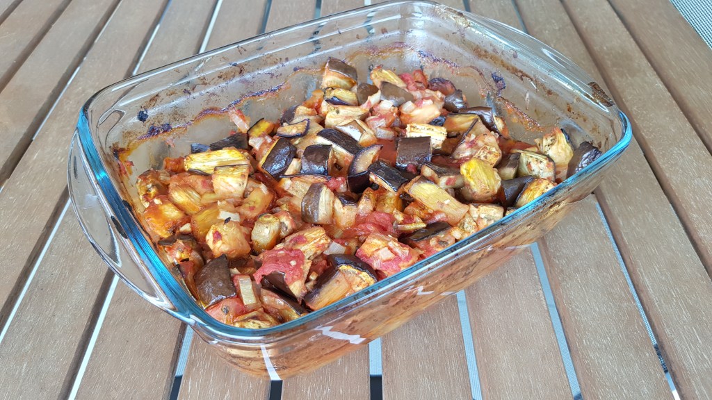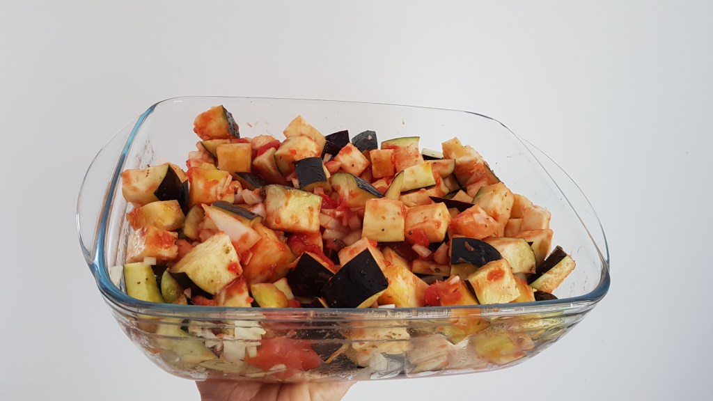 Introducem vasul neacoperit in cuptorul preincalzit la 200 grade pentru o ora. La jumatatea timpului, scoatem vasul din cuptor si amestecam cu o lingura astfel incat legumele de pe fundul vasului sa ajunga deasupra.