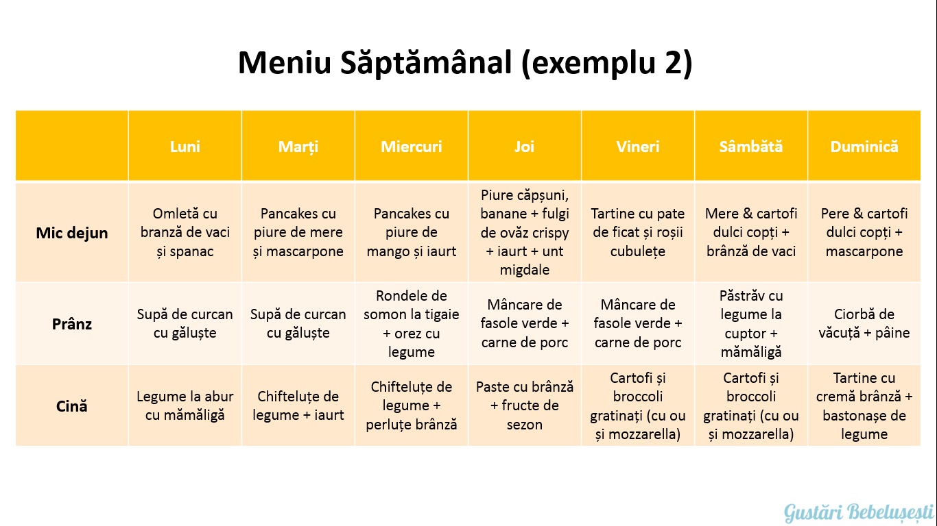 | MIERCURI Mic dejun: Pancakes cu piure de mango și iaurt Prânz: Rondele de somon la tigaie + orez cu legume Cină: Chifteluțe de legume + perluțe brânză |