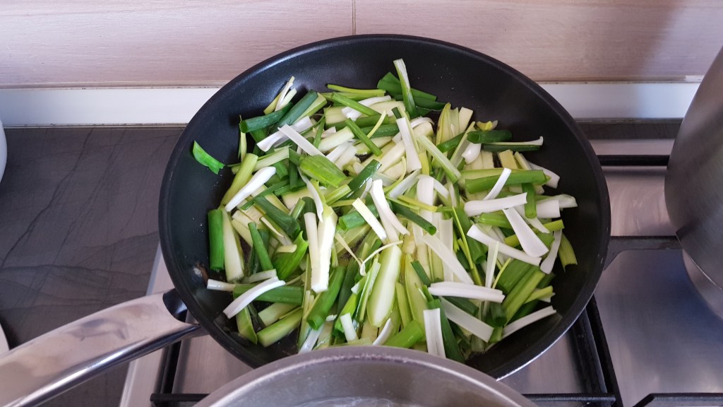 Taiem ceapa verde si usturoiul verde in bucati mai maricele de aprox. 3-4 cm
