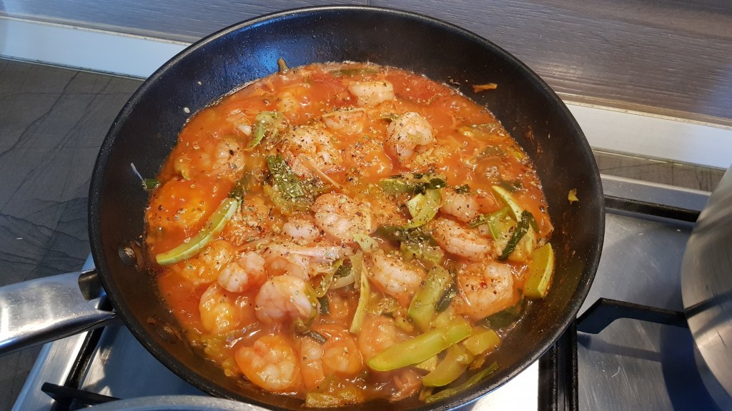Dupa aceasta perioada, scoatem legumele pe o farfurie, tigaia ramane pe foc, iar peste lichidul ramas in tigaie adaugam crevetii. Ii lasam sa se faca 2-3 minute in tigaia neacoperita, atat cat sa se evapore din lichid si sa inceapa sa se stranga. Acesta este momentul in care adaugam rosiile, legumele partial gatite anterior si condimentele. Acoperim din nou tigaia si lasam la inabusit pentru aprox. 7-8 minute.